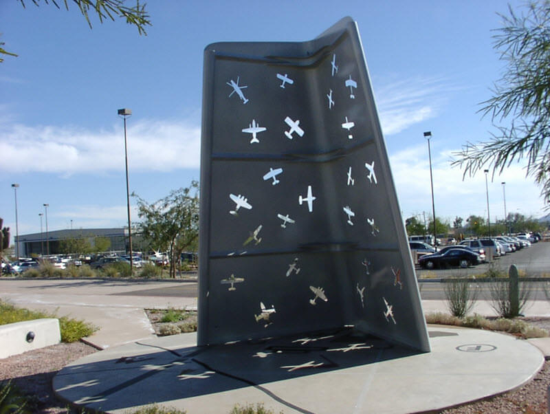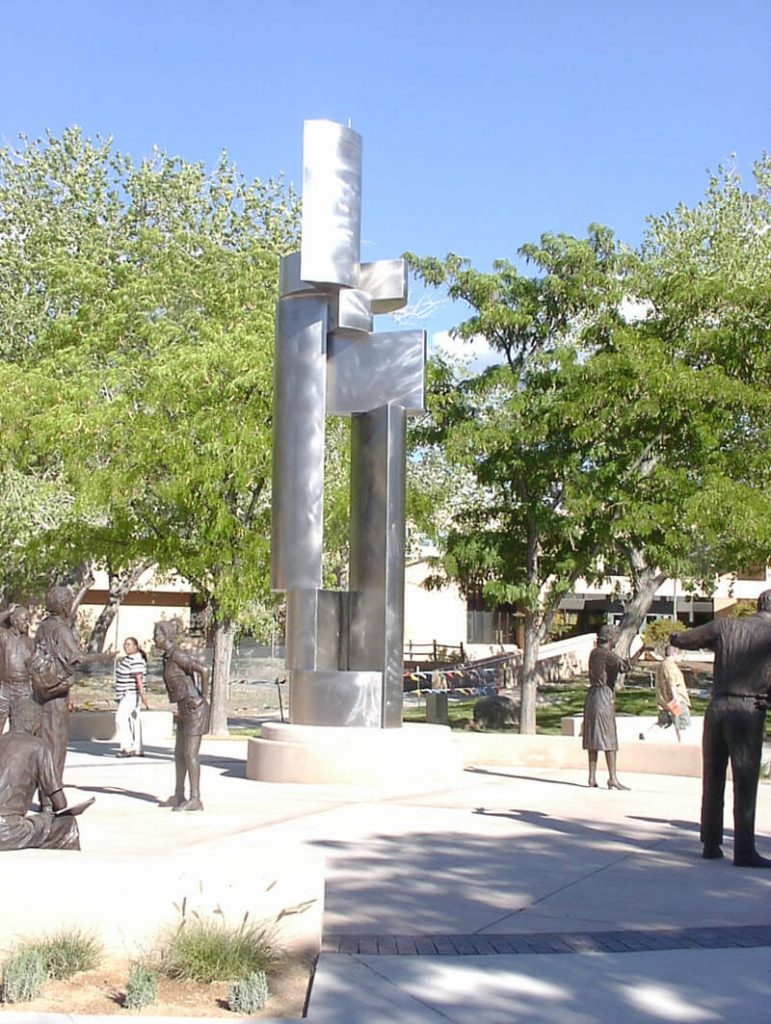K-zell Metals fabricated a large portion of this sculpture including the bronze sheet, tubing, and plate to create the mid sections of this sculpture by Tom Otterness. K-zell Metals provided these fabrications to Bollinger Atelier who did the bronze castings and final assembly. This is one of 4 identical sculptures.All Fabrication by K-zell Metals.K-zell Metals Translated Hand Sketches into Solidworks Models for Customer Approval, then Laser Cut, Formed, Welded, and Coated.K-zell Metals Translated Hand Sketches into Solidworks Models for Customer Approval, then Laser Cut, Formed, Welded, and Coated.K-zell Metals Translated Hand Sketches into Solidworks Models for Customer Approval, then Laser Cut, Formed, Welded, and Coated.K-zell Metals Cut, Formed and WeldedK-zell Metals Developed the Pattern Layout for the Curved Features of the Ribbon and Then Cut and Formed the Ribbon.K-zell Metals Mitered Cut and Split Cut a Pipe Length Way Then Welded the Horizontal Plates Creating the Sign. The Welds Were Then Ground Smooth and the Sign Sent out for Coating.K-zell Metals Assisted the Artist Polish the Stainless Sheet in the Flat Condition. We then Cut the Parts, Formed Them, Welded Them, and Ground the Welds Smooth Without Damaging the Balance of the Pre-Polished Surface. The Finished Piece is Located at the University of New Mexico.